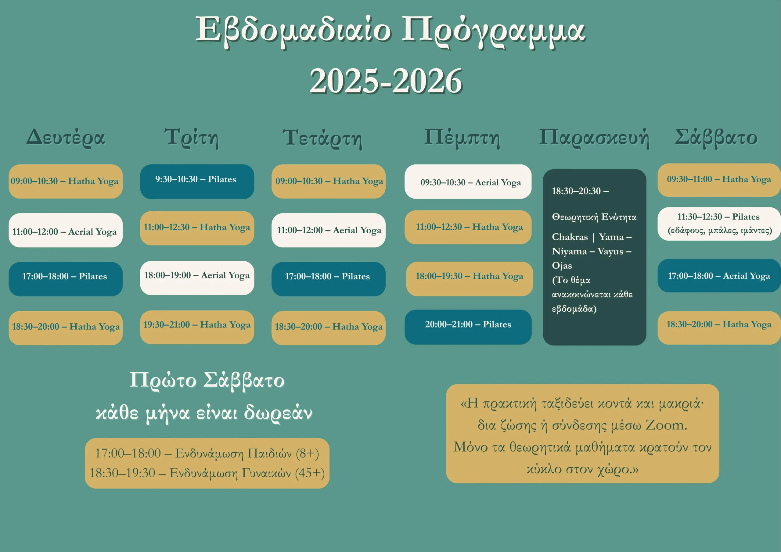 Οι συναντήσεις περιλαμβάνουν ποικιλία μαθημάτων, από ήπιες πρακτικές ευεξίας έως πιο δυναμικές μορφές άσκησης, καθώς και θεωρητικές ενότητες που διευρύνουν την κατανόηση του σώματος και του πνεύματος.